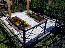 Первым делом мы убрали с территории могилы всю сорную траву, как из цветников, так и проросшую сквозь крошку. Затем вынули из цветников старую землю, засыпав на её место новый, плодородный грунт. В эту почву высадили заранее подготовленные живые цветы, которые гарантированно примутся на могилах. В заключении отсыпали территорию участка свежей мраморной крошкой, которая покрыла потускневший от времени настил. В результате у нас получилась опрятная и аккуратная могила, которой заказчик остался очень доволен.